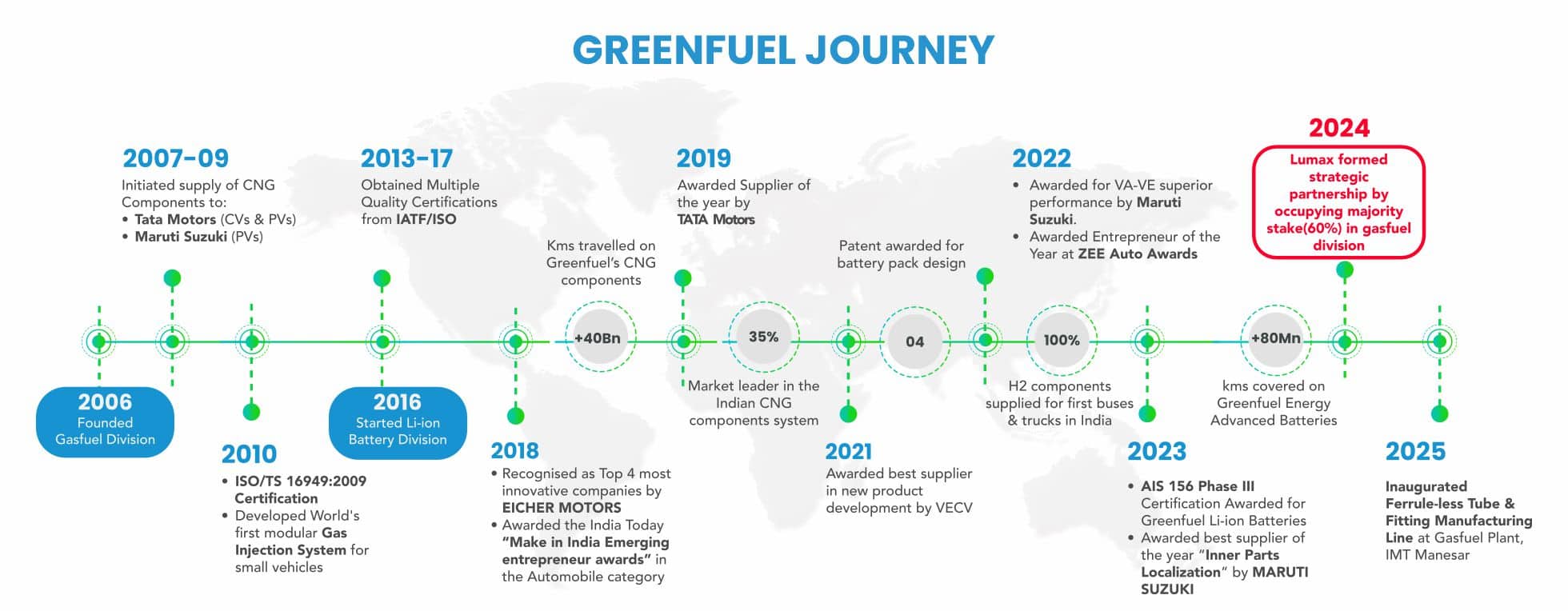 We are the first company to introduce NGV filling systems in cars as well as automatic cylinder valves, and the only company to do complete fuel delivery and storage systems for low-floor buses in India. Our gas fuel systems are tried and trusted by leading names in the automotive sector and gas distribution companies in India and the global market. Our Components have completed more than 40 billion km on road, making us the only company to achieve this milestone. Notably, 8/10 buses in India are running on Greenfuel-supplied components.